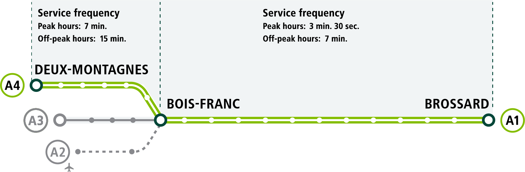 Starting March 6, the new service frequency will be tested on the network. These frequencies correspond to those planned for the launch of the new A3 – Anse‑à‑l’Orme branch, which is still scheduled for this spring.
