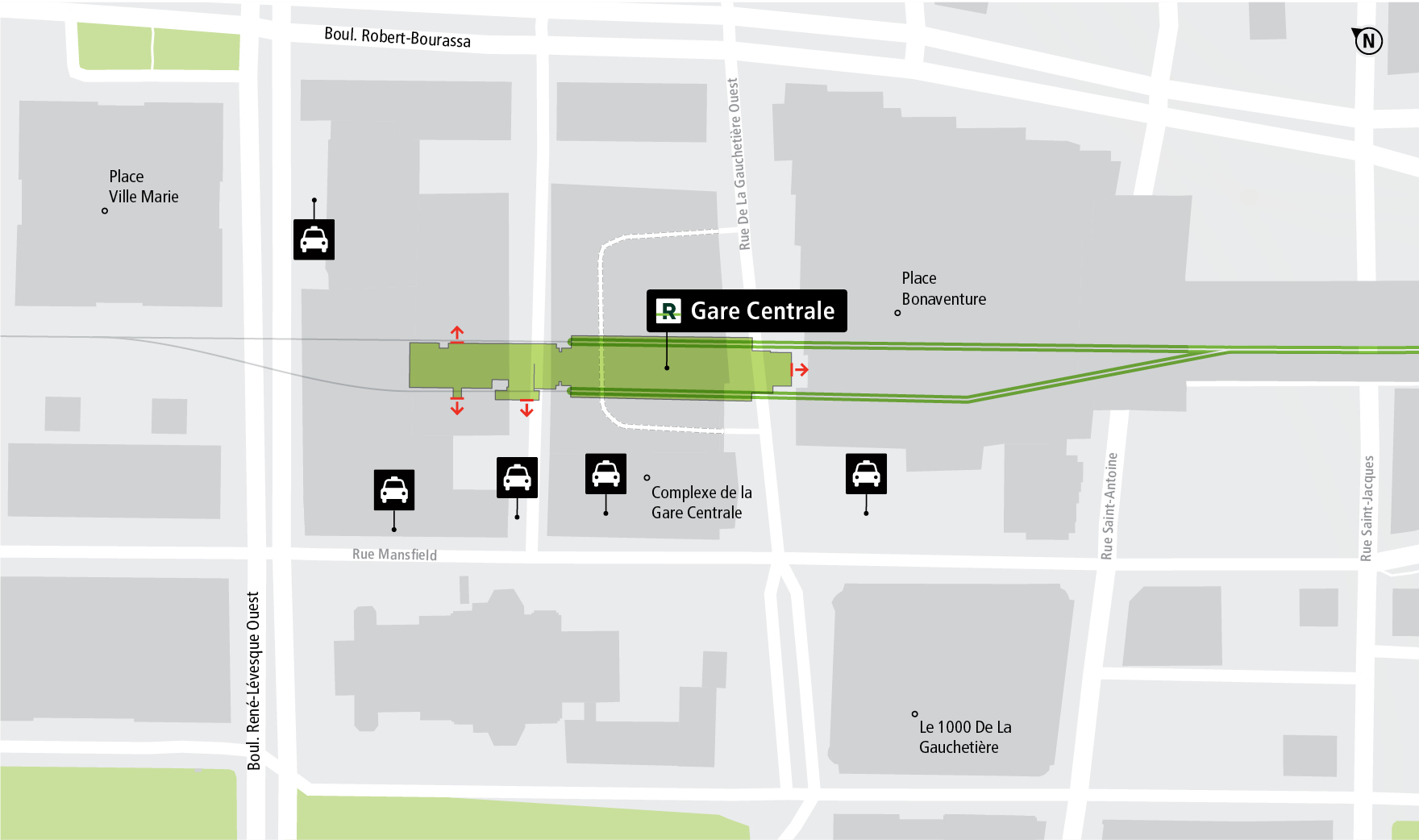 The Gare Centrale Station is located in the Mansfield Street, De La Gauchetière Street West and Belmont Street block.