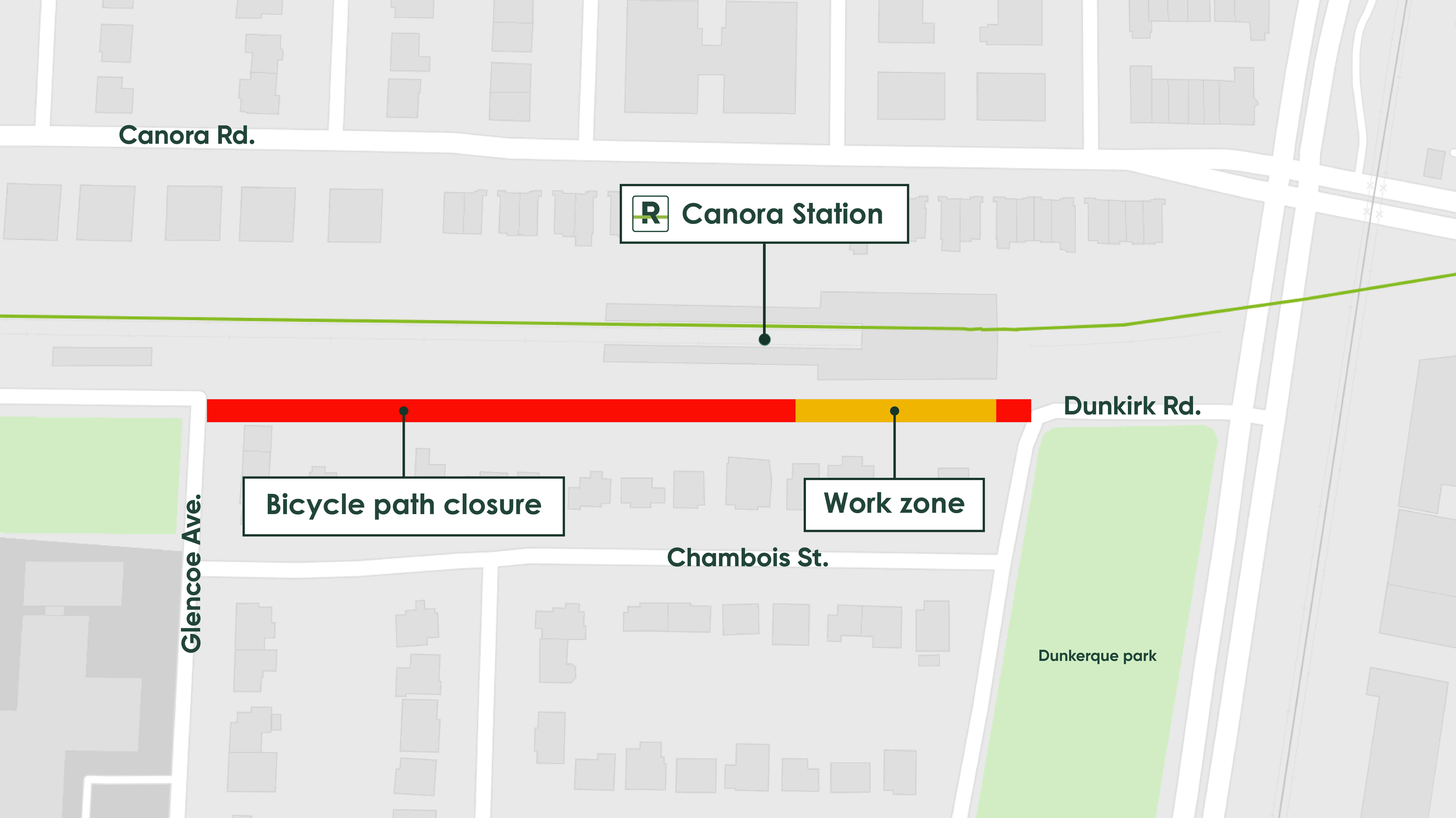 - A full closure of the bike path running along Canora station, behind Chambois Street, will be required for the entire duration of the work.