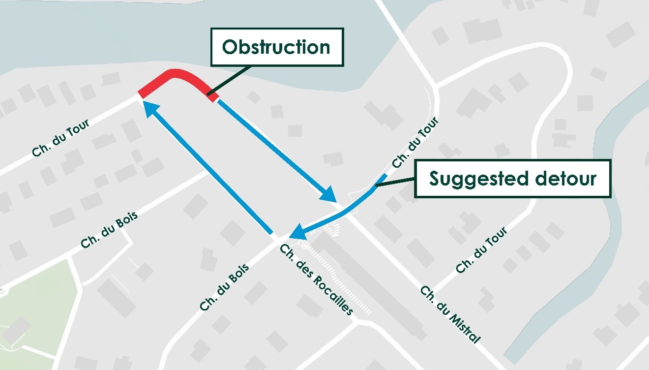 To accomplish this, these works will require a complete closure of a portion of Chemin du Tour. Please note that at no time will access to nearby residences be restricted.