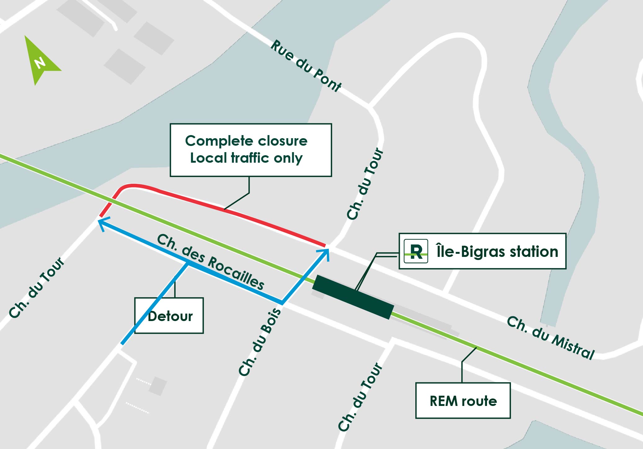 In order to complete the installation of the REM electrical substation, a temporary obstruction to pedestrian, automobile and bicycle traffic will be required on a portion of Chemin du Tour between Rivière des Prairies and the REM viaduct.