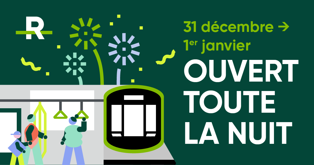 Dansez, célébrez et laissez le REM vous raccompagner en toute sécurité! Pour célébrer la nouvelle année sans tracas, le REM sera en service toute la nuit du 31 décembre au 1er janvier 2026, sur l’ensemble du réseau, entre Brossard et Deux-Montagnes. Un titre de transport habituel sera requis pour voyager sur le réseau.