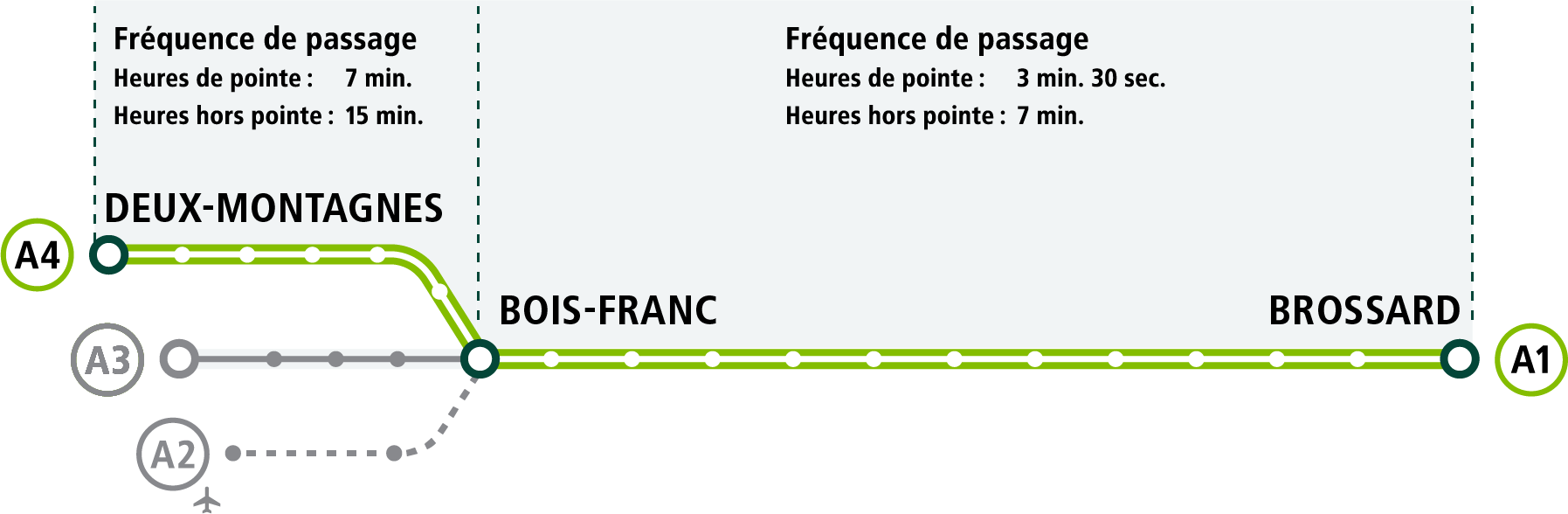 | Entre Bois-Franc et Deux-Montagnes | 7 minutes | 15 minutes |