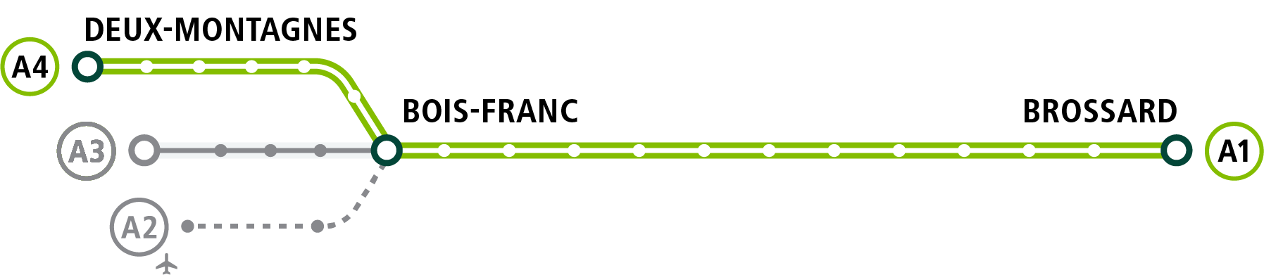 À la station Bois‑Franc, vous pourrez facilement faire une correspondance pour passer d’un REM en direction Bois‑Franc à un REM en direction A4 – Deux‑Montagnes et poursuivre votre trajet sans difficulté.