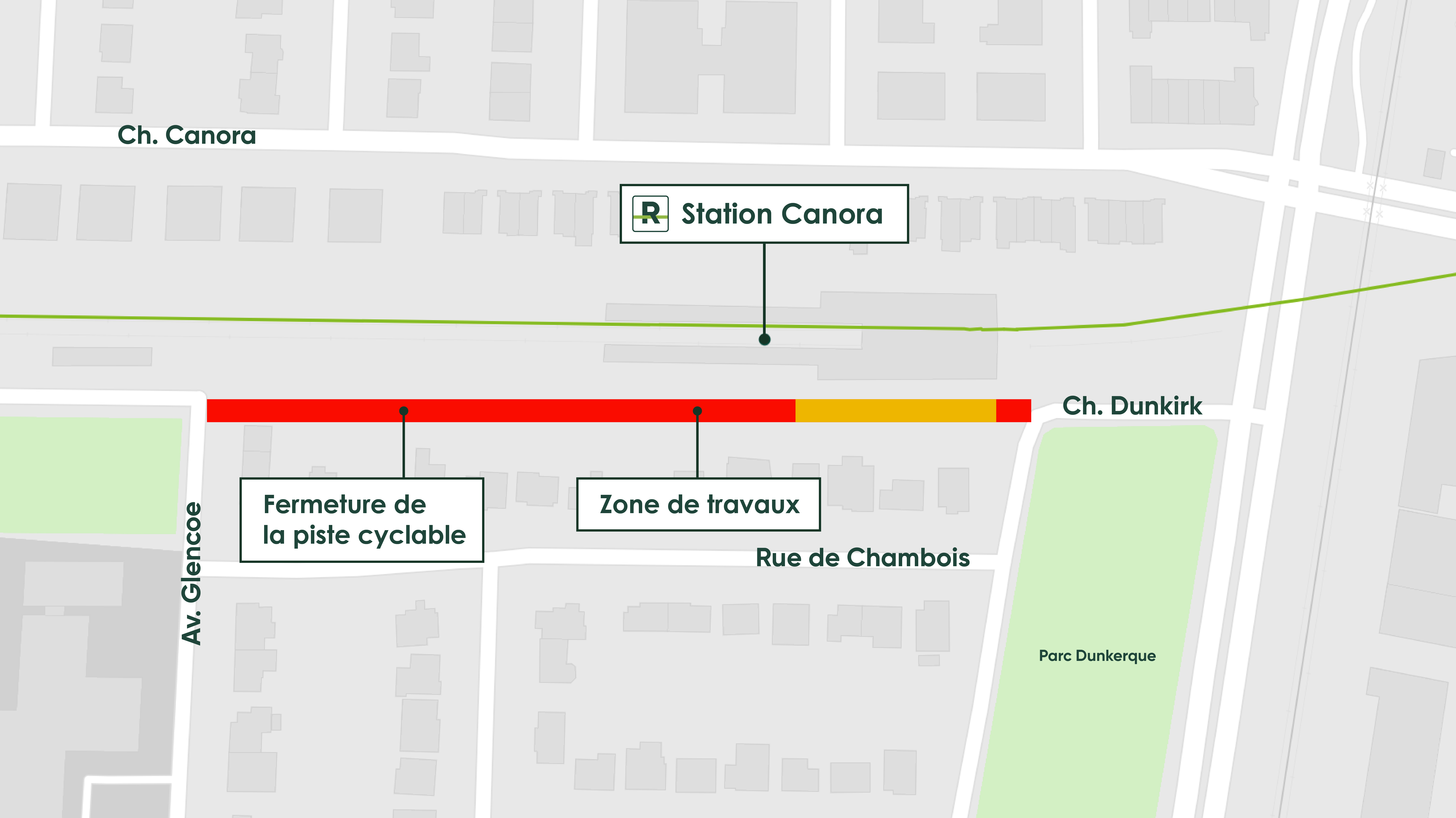 À cette fin, une fermeture complète de la piste cyclable longeant la station Canora, à l’arrière de la rue de Chambois, sera requise pour toute la durée des travaux.