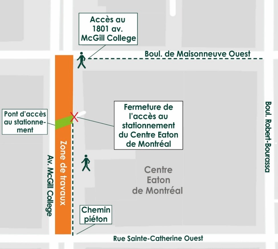 Afin de procéder à l’installation du pont d’accès au stationnement métropolitain du Centre Eaton de Montréal, une fermeture temporaire de l’entrée et de la sortie du stationnement est nécessaire. Ce pont d’accès sera en place jusqu’à la finalisation des travaux de la future station du Réseau express métropolitain en 2022.
