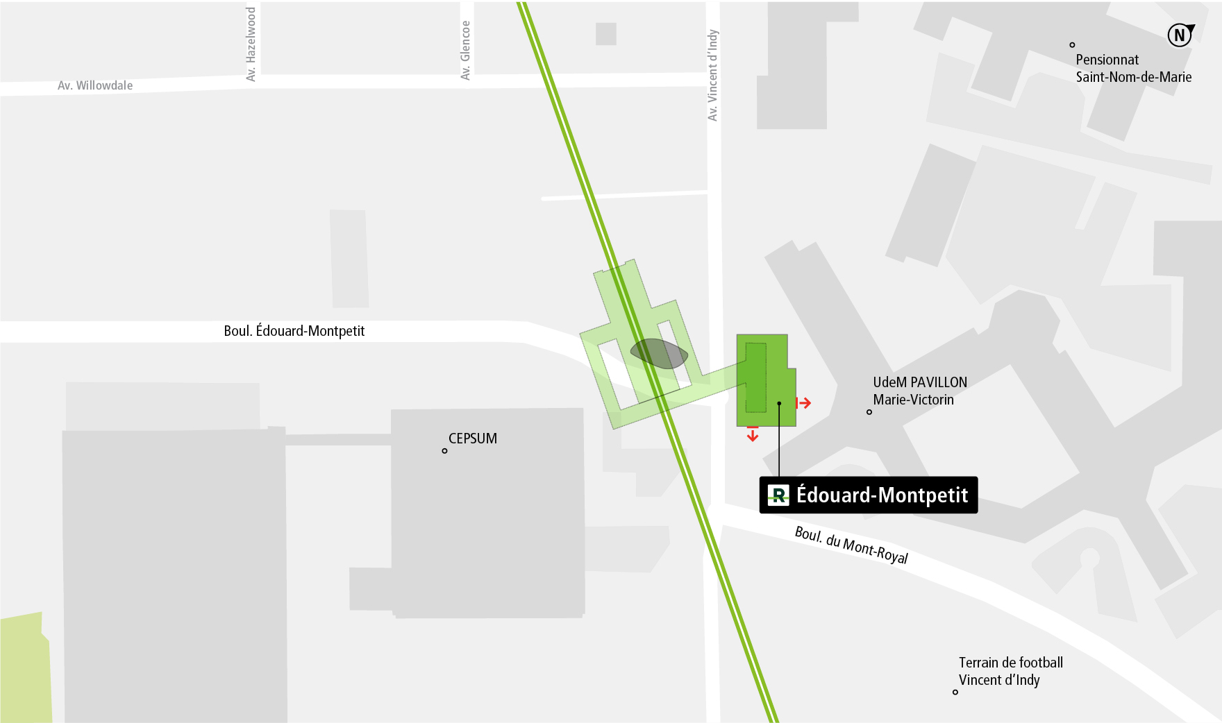 La station Édouard-Montpetit est située au coin de l'avenue Vincent-D'Indy et du boulevard Édouard-Montpetit, en face du pavillon Marie-Victorin de l’Université de Montréal.