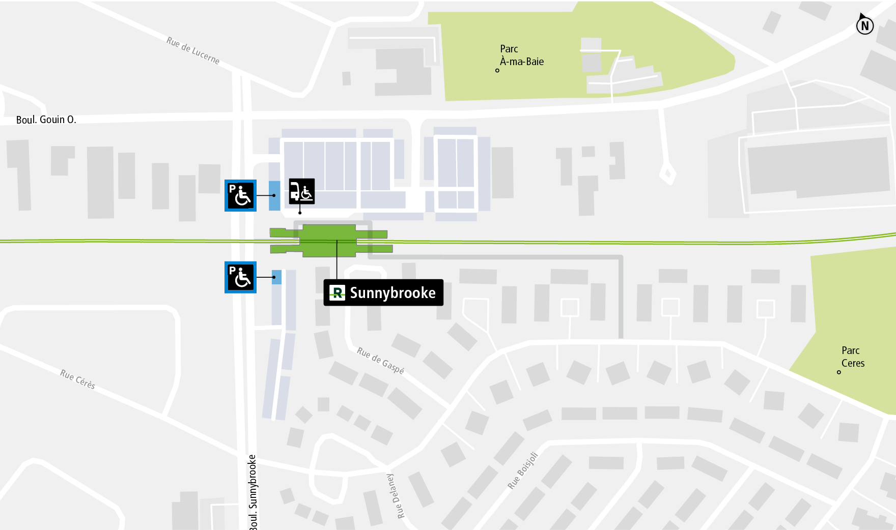 Un quai dédié pour le transport adapté est localisé dans le stationnement, accessible par le boulevard Gouin Ouest entre le boulevard Sunnybrooke et la rue Robitaille.